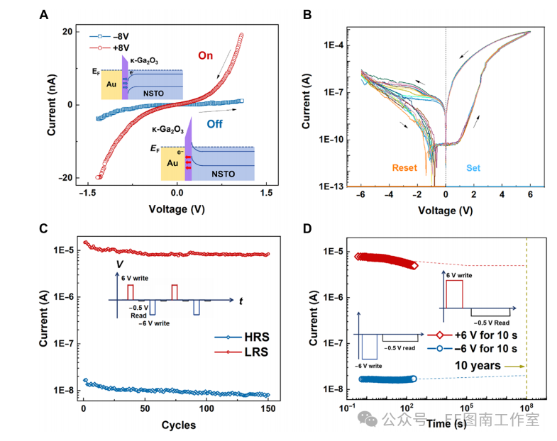 图5. 高性能铁电隧道结。(A) Pt/κ-Ga2O3(5纳米)/NSTO器件的电流-电压特性曲线,插图为器件结构示意图及高阻态(HRS)与低阻态(LRS)的能带排列图,EF表示费米能级。(B) 在±6V编程电压下可重复的电阻开关特性,展示了具有巨大隧穿电阻比(TER)的非易失性存储器操作。(C) 开关循环稳定性测试显示150次循环后电阻退化率<5%,插图为编程脉冲序列。(D) 保持特性测试表明高/低阻态在>250秒内保持稳定,预计寿命可达数年,插图为两种阻态的读取脉冲序列。