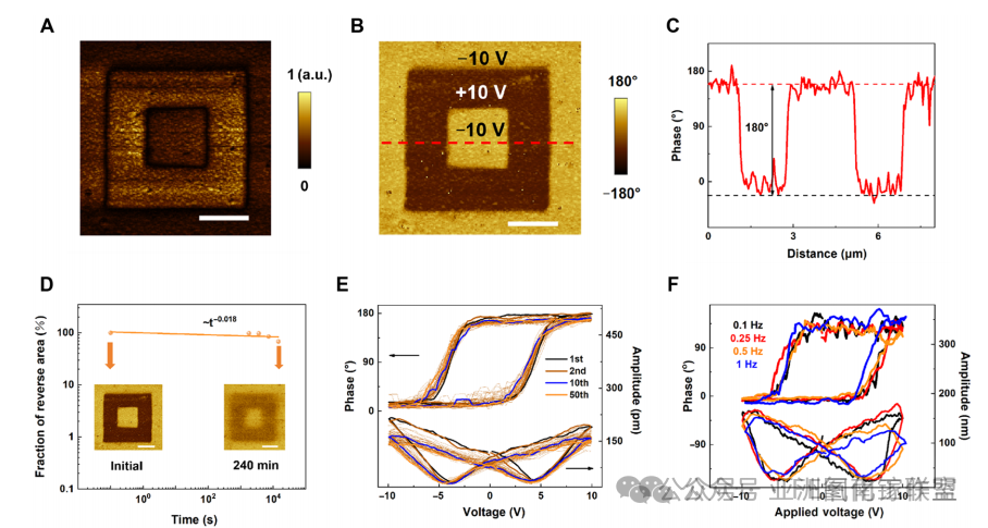 图2. 超薄κ-Ga2O3薄膜的纳米级铁电开关特性。(A和B)在±10V偏压下进行畴写入后,NSTO衬底上5nm κ-Ga2O3的PFM振幅和相位图像,比例尺为2μm。(C)沿(B)中标记线的相位分布,显示相反极化畴之间的180°相位对比。(D)畴保持特性测试显示4小时内具有卓越稳定性(幂律衰减指数α=0.018),插图为初始和最终相位图像,其中初始图像(t=0分钟)对应(B)图(保持测试起点),最终图像(t=240分钟)对应图S5的最终时间点。(E)局部PFM迟滞回线(50次循环)展示可逆的振幅和180°相位切换。(F)频率相关的离场迟滞曲线证实了区别于静电伪影的本征铁电行为。
