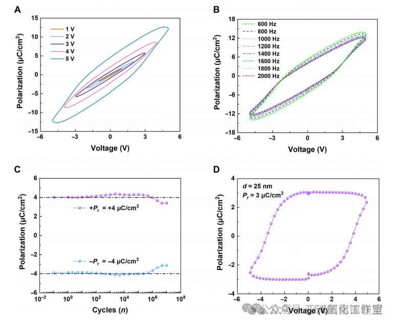 图3. 宏观极化与耐久特性。(A)不同电压下的P-V电滞回线,显示饱和开关行为;(B)频率相关的P-V回线呈现典型铁电响应;(C)在±5V/100kHz条件下经历10⁷次开关循环后仍保持>95%极化强度的优异抗疲劳特性;(D)5nm薄膜的PUND测试证实其本征开关特性,剩余极化强度Pr=3μC/cm²,与最先进超薄铁电器件性能相当。