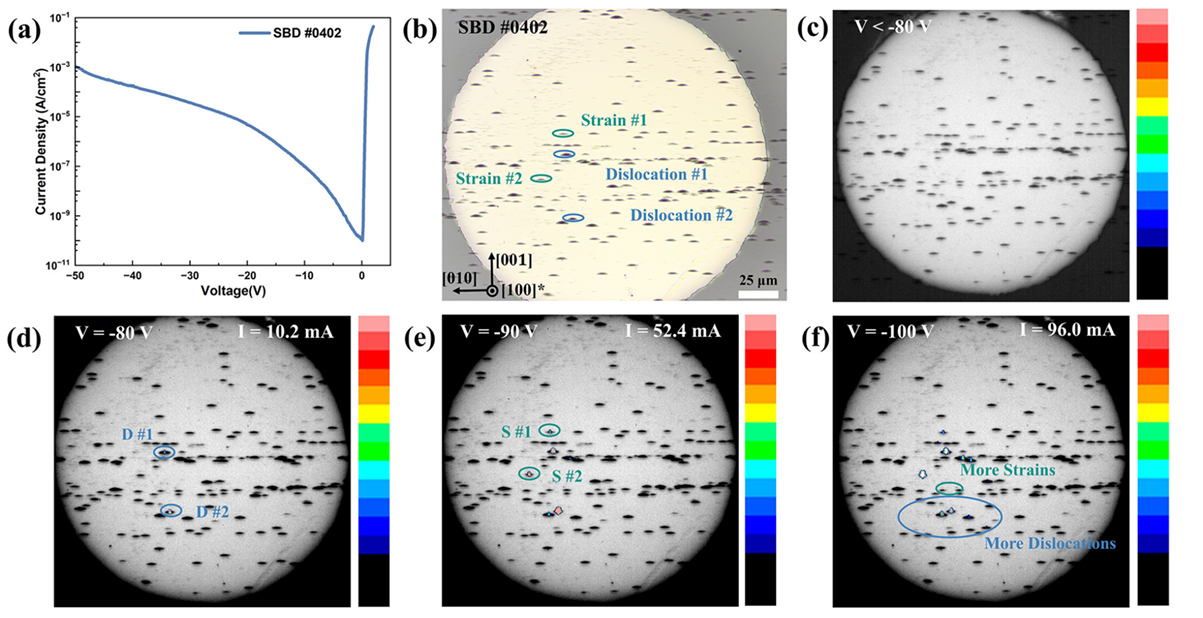 图 6. (a)SBD #0402 的 J-V 特性曲线和(b)OM 图像。(c)至(f)SBD #0402 在反向偏压 0 至 105 V 下的发射显微镜图像。
