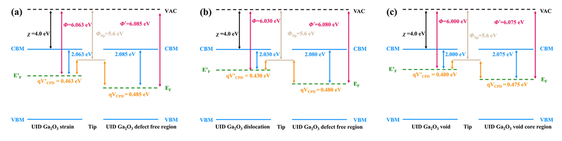 ● 使用 KPFM 分析了 (100) β-Ga2O3 上的三类缺陷,并通过在调制偏压下的 EMMI 进行了验证。
