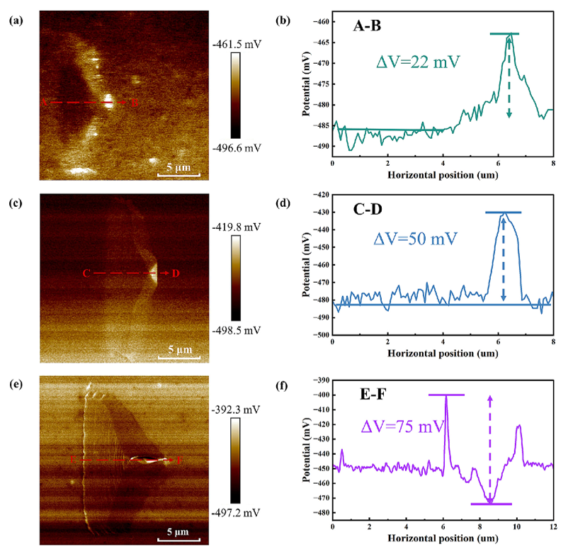 图 3. 包含蚀坑的表面电位图以及蚀坑表面电位的线轮廓图,分别为(a-b)应变相关蚀坑、(c-d)位错相关蚀坑和(e-f)空洞相关蚀坑。