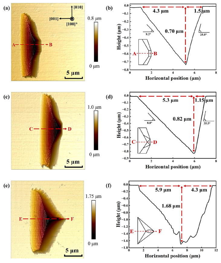 图 2. 具有代表性的(a-b)应变相关蚀坑、(c-d)位错相关蚀坑和(e-f)空洞相关蚀坑的表面形貌及深度剖面图,插图是示意图。