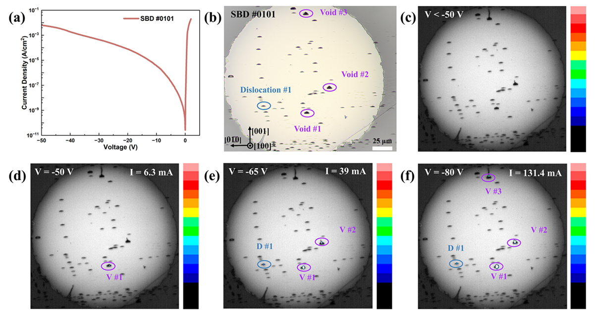 图 5. (a)SBD #0101 的 J-V 特性曲线和(b)OM 图像。(c)至(f)SBD #0101 在反向偏压 0 至 80 V 下的发射显微镜图像。