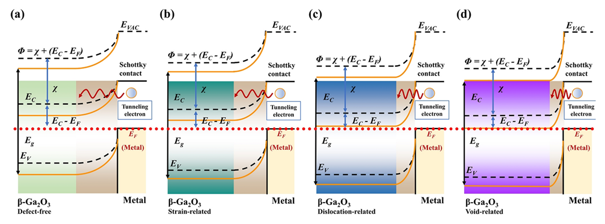 图 7. 基于肖特基接触区附近能带结构的可能机制示意图,分别展示了(橙色实线)和未施加(黑色虚线)反向偏压时(a)无缺陷、(b)与应变相关、(c)与位错相关以及(d)与空洞相关的位点情况。
