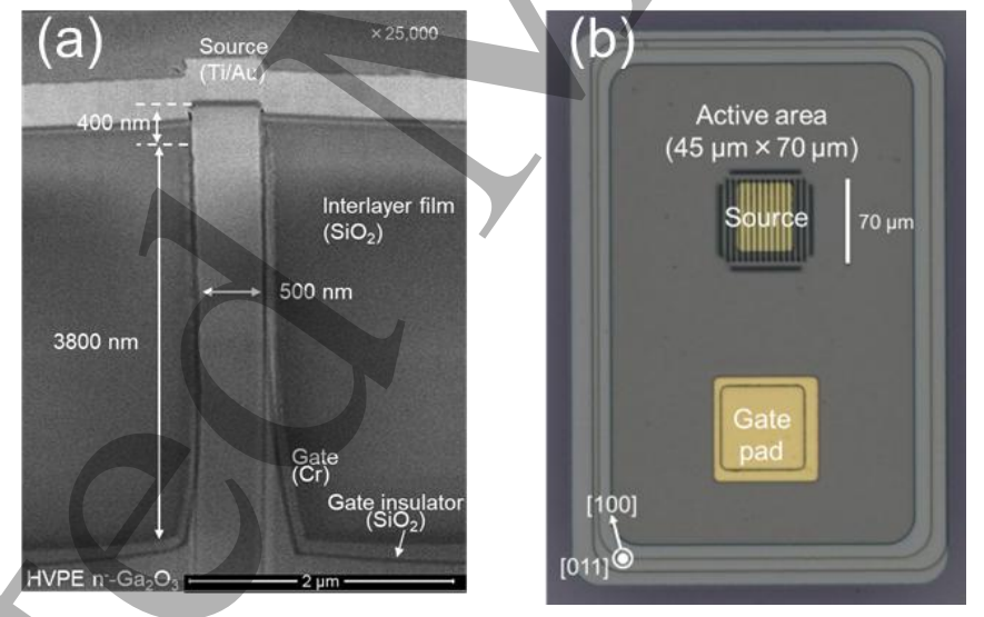 图 3. (a) 鳍沟道的扫描电子显微镜(SEM)横截面图。 (b) 多鳍 β-Ga2O3 垂直晶体管的光学顶视图。