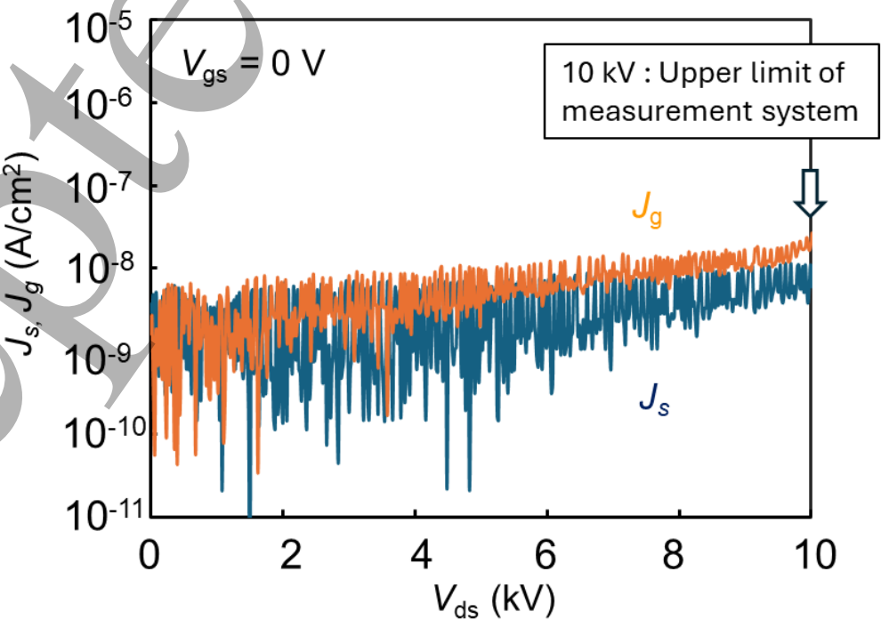 图 6. 垂直 β-Ga2O3 多鳍场效应晶体管的三端关断状态(Vgs = 0 V)Jd、Jg-Vds 特性。