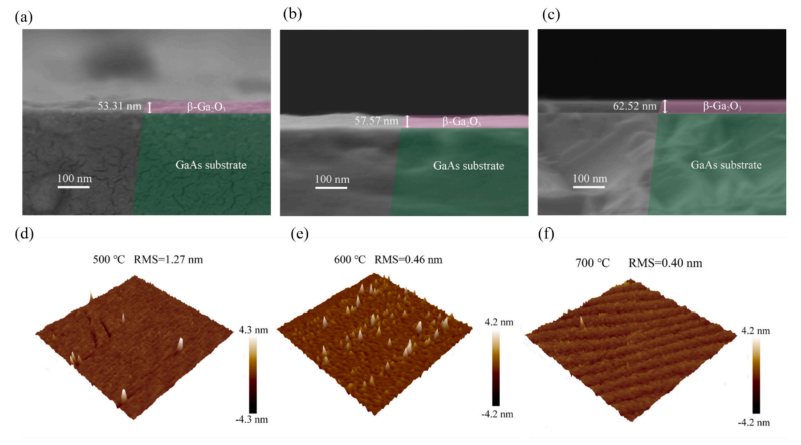 图2. (a-c) 在 (a) 500 °C、(b) 600 °C 和 (c) 700 °C 下生长的 β-Ga2O3 薄膜的截面扫描电子显微镜图像; (d-f) 衬底温度分别为 (d) 500 °C、(e) 600 °C和 (f) 700 °C 时生长的 β-Ga2O3 原子力显微镜形貌图。