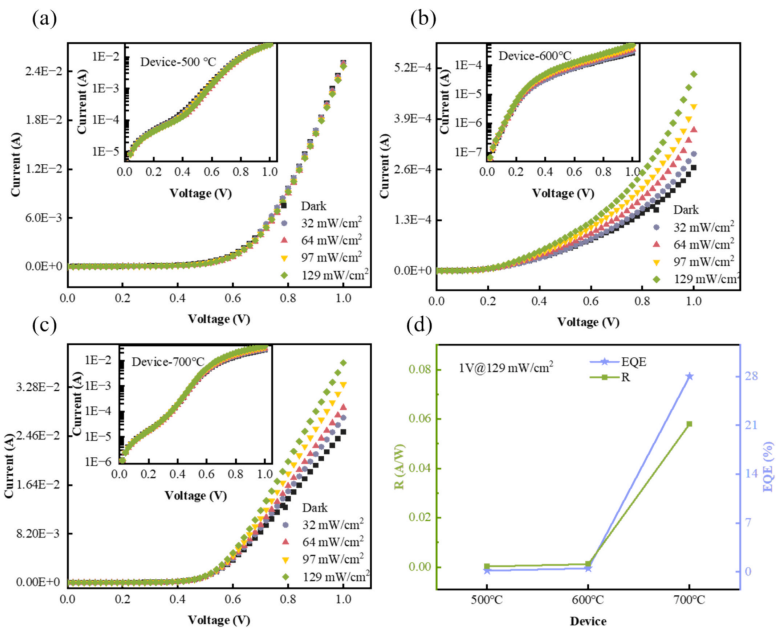 图4. (a-c) 器件在 500 °C、600 °C 和 700 °C 的 I-V 特性曲线(线性坐标);(插图:对数坐标); (d) 器件在 500 ℃、600 ℃ 和 700 ℃ 在 1 V @ 129 mW/cm2 条件下 EQE 与 R 的对比。