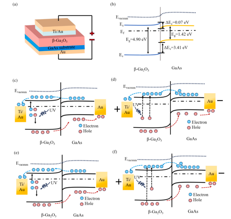 图5. (a) β-Ga2O3/GaAs 异质结光探测器结构示意图; (b) β-Ga2O3 与 GaAs 异质结能带对齐示意图;(c-d) β-Ga2O3/GaAs 异质结器件(Device-500 ℃ 与 600 ℃)在 (c) 零偏压及 (d) 正向偏压紫外照射下的能带示意图;(e-f) 700 ℃ 器件在 (e) 零偏压和 (f) 正向偏压紫外照射下的对应能带图。