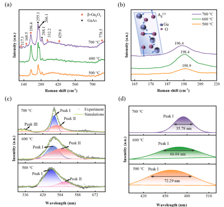 图3. (a) β-Ga2O3 的拉曼光谱;(b) 局部区域的放大拉曼光谱;(c) β-Ga2O3 薄膜的荧光光谱;(d) 荧光光谱中峰 I 的半高宽。