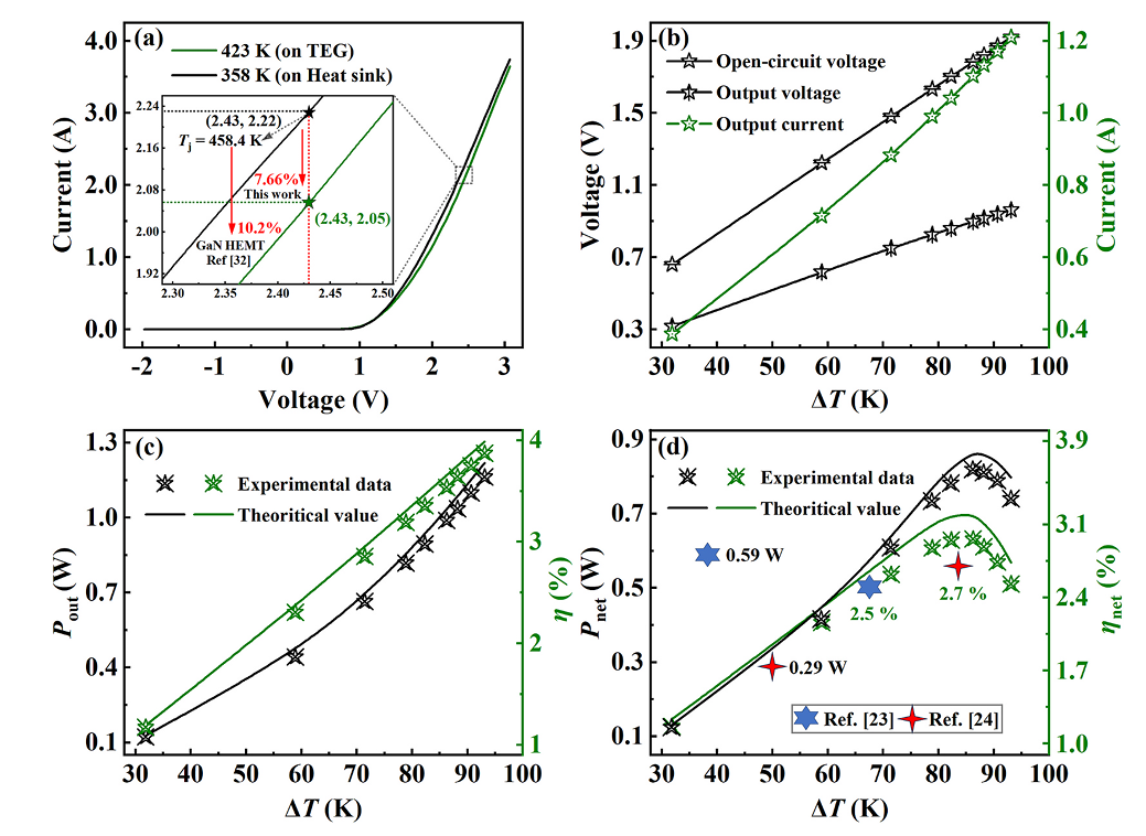 图 7. (a) 不同散热模块下 SBD 的电流-电压特性;(b) TEG 上下表面温差与输出电压及输出电流的关系;(c) 输出功率与转换效率;(d) 对应温差下净输出功率与净转换效率。