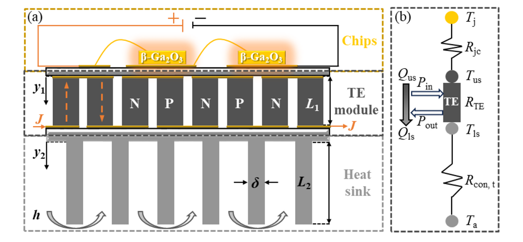 图 2. (a) 基于 β-Ga2O3 SBD 的热电系统示意图;(b) 温度及热阻分布图。