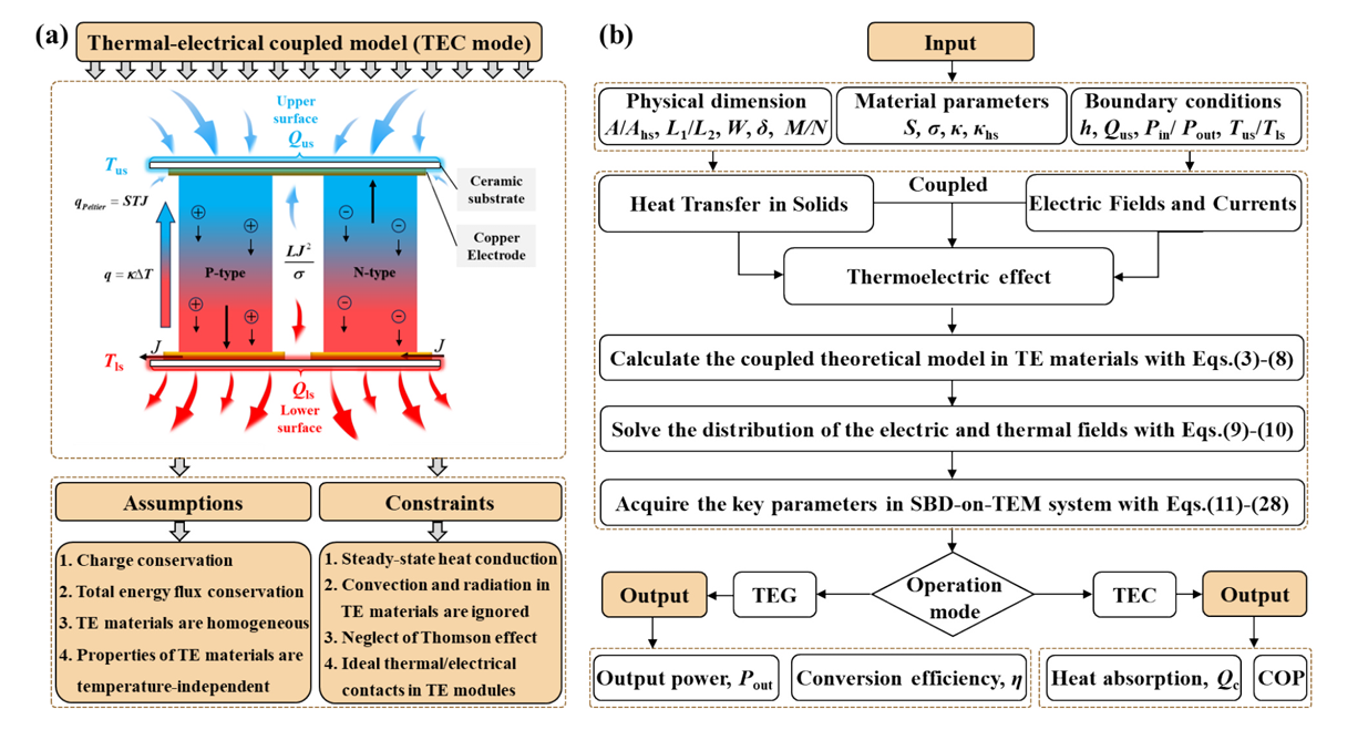 图 1. (a) 耦合热-电场模型(以 TEC 为例)及相应假设与约束条件;(b) 一维理论模型流程图。