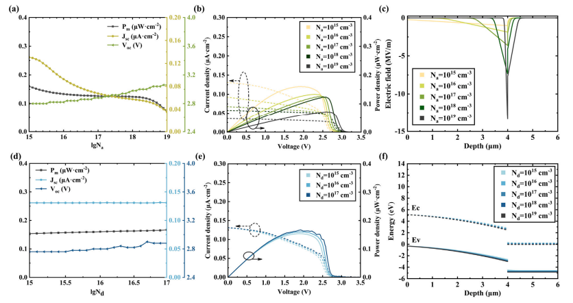 图3. (a) 输出功率密度(Pm)、短路电流密度(Jsc)和开路电压(Voc);(b) 电流密度-电压(J-V)与功率密度-电压(P-V)特性曲线;(c) p区掺杂浓度(Na)的电场分布。参数:Nd = 1016 cm−3,Hp = 4 μm,Hn = 2 μm。(d)Pm、Jsc与Voc,(e)J-V特性曲线,(f)热平衡状态下的能带图,均为与n区掺杂浓度(Nd)的函数关系。参数:Na = 1015 cm−3,Hp = 4 μm,Hn = 2 μm。