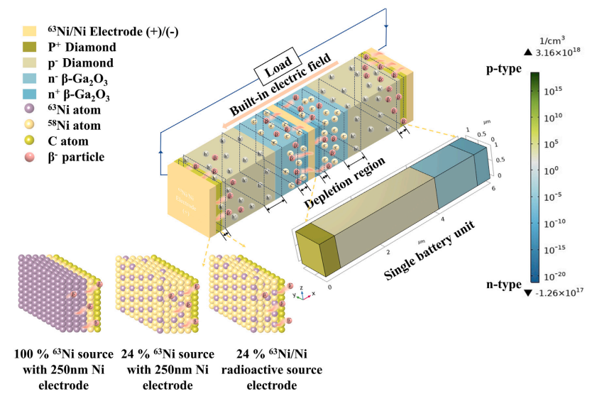核电池(又称放射性同位素电池)具有体积小、寿命长、稳定性高等优点,是极端环境下微机电系统、植入式医疗设备和深海探测器等应用的理想微型电源。在各类核电池中,倍他伏特核电池直接将β射线(电子)的能量转化为电能,具有较高的转换效率。金刚石以其超宽的禁带宽度、优异的抗辐射能力和高载流子迁移率,被认为是制造高开路电压核电池能量转换器的最佳材料。然而,金刚石核电池的发展面临三大挑战:1)放射源自身的能量损失;2)β 粒子在金刚石中穿透深度浅,能量利用率低;3)金刚石难以实现高质量的 n 型掺杂,阻碍了 p-n 同质结的制备。为了克服这些困难,将 p 型金刚石与一种晶格匹配且能带结构合适的 n 型宽禁带半导体构成异质结,是一种极具前景的技术路线。 其中,n 型 β-Ga2O3 因其宽禁带和与金刚石无晶格失配的特点,成为理想的匹配材料。