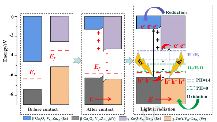 β-氧化镓(β-Ga2O3)因其超宽禁带(约4.9 eV),在日盲紫外探测领域具有巨大应用潜力。然而,β-Ga2O3 材料在制备过程中不可避免地会产生本征氧空位(VO)缺陷。 这些氧空位会形成深受主能级,俘获空穴,充当载流子复合中心,并阻碍载流子输运,从而严重限制了器件的性能,如导致响应速度慢和暗电流大等问题。构建异质结是一种有效的性能提升策略,其中 ZnO/β-Ga2O3 因其良好的能带匹配而备受关注。界面工程,特别是通过在界面处进行相互掺杂,有望调控异质结的能带结构和电荷输运特性,从而抑制氧空位带来的负面影响。本研究系统性地探究了 g-ZnO/β-Ga2O3 异质结的光电特性。特别探讨了通过引入 VO、GaZn 和 ZnGa 等本征缺陷调控异质结光电行为的机理。该掺杂策略成功制备出性能增强的异质结光电子器件,为设计高效光电子系统奠定了理论基础。