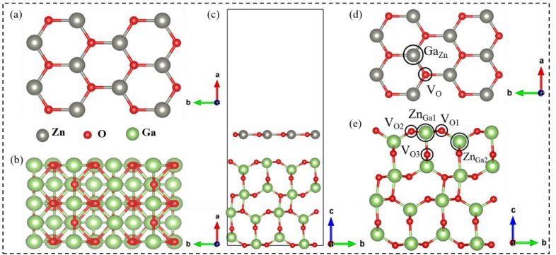 图1 模型:(a) 结晶 ZnO,(b) (100) β-Ga2O3,(c) 结晶 ZnO/β-Ga2O3 异质结,(d) 含 VO 的 GaZn 掺杂结晶 ZnO,(e) 含 VO 的 ZnGa 掺杂(100) β-Ga2O3。