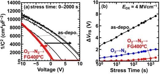 图6. (a) 应力测试测量期间的 1/C2–V 特性曲线(应力时间:0、100、1000和2000秒)及(b) Ga2O3 MOS结构中平带电压漂移的应力时间依赖性。测量期间的电压扫描速率约为1 V·s−1。