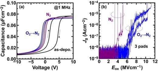 图2. (a) 在 1 MHz 频率下测得的 Ga2O3 MOS 结构双向 C-V 特性曲线。测量过程中电压扫描速率约为 1 V s−1。(b) 不同 PDA 气氛处理下 Ga2O3 MOS 结构的漏电流密度-氧化层电场特性曲线。