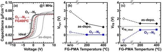 图3. (a) 在 1 MHz 频率下测得的 Ga2O3 MOS 结构双向 C-V 特性曲线。测量期间电压扫描速率约为 1 V s−1。图中同时标注了理想 C-V 特性曲线。(b) 基于双向 C-V 特性曲线评估的 FG-PMA 处理样品 C-V 滞后现象。(c) 经 FG-PMA 处理样品中观测到的平带电压偏移。平带电压偏移值通过正向 C-V 特性与理想特性曲线间的差值计算得出。