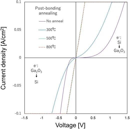 图8. I–V 为不同后键合退火条件下键合 β-Ga2O3/Si 试样的特性曲线。超过 500℃ 的退火可实现欧姆型 β-Ga2O3/Si 接触。
