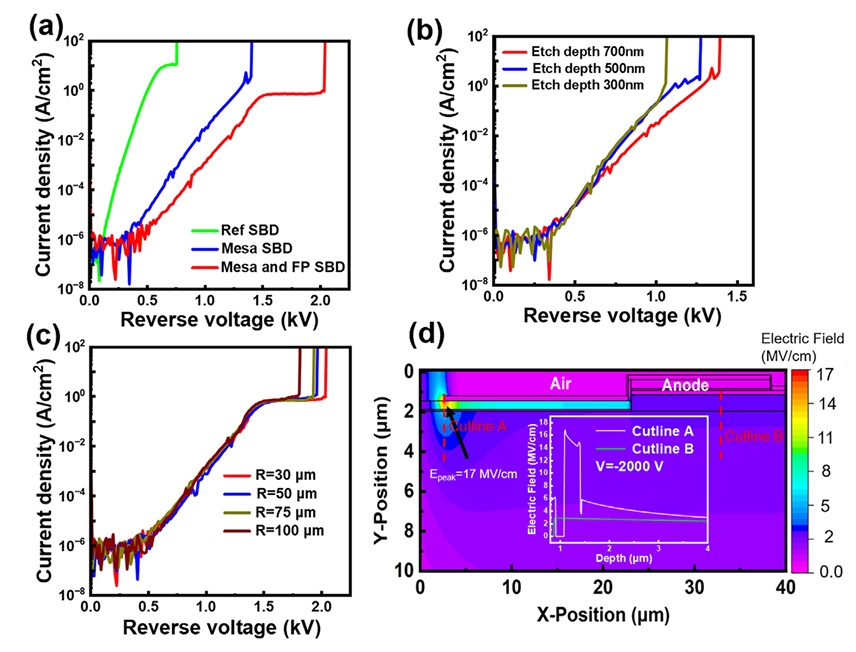 图3.(a)阳极直径为 60 μm 的 Ref-SBD、Mesa-SBD 和 DFPM-SBD 的反向特性。(b)不同刻蚀深度的 Mesa-SBD 的反向特性。(c)不同阳极面积的 DFPM-SBD 的反向特性。(d)在反向偏压 2000 V 下,DFPM 器件的模拟临界电场分布。
