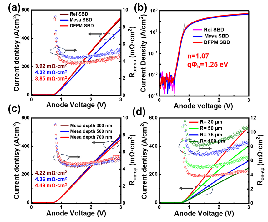 图2.(a)Ref-SBD、Mesa-SBD 和 DFPM-SBD 的归一化直流正向 IF–VF 特性(线性坐标)及比导通电阻 Ron,sp–VF 测量结果。(b)Ref-SBD、Mesa-SBD 和 DFPM-SBD 的归一化直流正向 IF–VF 特性(对数坐标)测量结果。(c)不同刻蚀深度(300、500 和 700 nm)Mesa-SBD 的归一化直流正向 IF–VF 特性(线性坐标)及比导通电阻 Ron,sp–VF。(d)不同阳极面积 DFPM-SBD 的归一化直流正向 IF–VF 特性(线性坐标)及比导通电阻 Ron,sp–VF。
