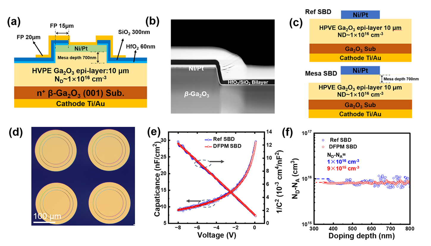 图1.(a)DFPM-SBD 的截面示意图。(b)DFPM-SBD 的 STEM 图像。(c)Ref-SBD 与 Mesa-SBD 的截面示意图。(d)DFPM-SBD 的光学显微镜图像。(e)Ref-SBD 与 DFPM-SBD 的归一化 C–V 以及 1/C2–V 曲线。(f)Ref-SBD 与 DFPM-SBD 的提取掺杂浓度 ND–NA。
