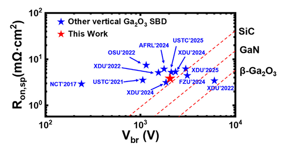 图4.已报道的最先进 β-Ga2O3 肖特基势垒二极管(SBD)的比导通电阻(Ron,sp)与击穿电压(Vbr)基准对比图。