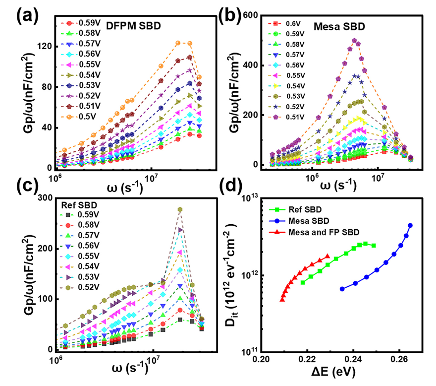 图5. (a) DFPM-SBD在0.59至0.5 V正向偏压下的Gp/ω提取曲线,步长为0.01 V。(b)Mesa-SBD的Gp/ω提取曲线。(c) Ref-SBD的Gp/ω提取曲线。(d)器件的Dit–△E曲线。