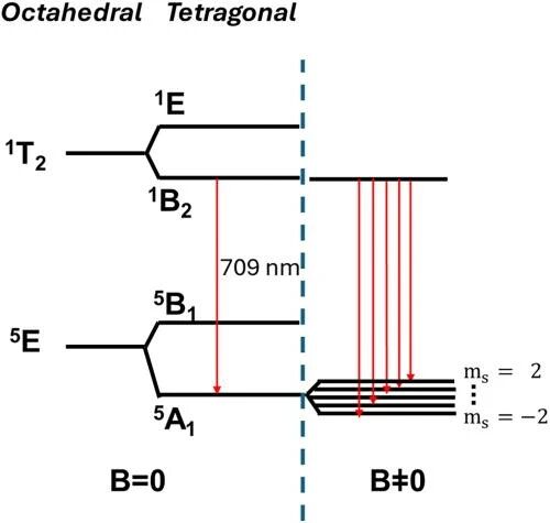图3. 示意图展示了位于具有 Oh 和 C4v 对称性的八面体位点的 TM 离子电子结构,其电子配置为 3d4。图中仅显示与 710 nm 发射相关的能级。为简化起见,省略了基态的精细结构分裂。图右侧描绘了 710 nm 中心 S=0 激发态与 S=5 基态的塞曼分裂。红色垂直箭头标示了监测到的光学跃迁。