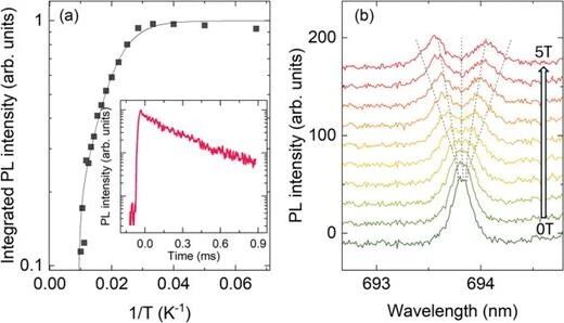 图4. (a) 694 nm 谱线积分强度的阿伦尼乌斯图。插图显示 7 K 下 694 nm 谱线的时间衰减曲线。(b) 磁致发光光谱显示 694 nm 谱线随外加磁场 (B) 变化的塞曼分裂现象。虚线表示采用自旋哈密顿量计算的塞曼分量能量,其参数与 710nm 发射谱相同。