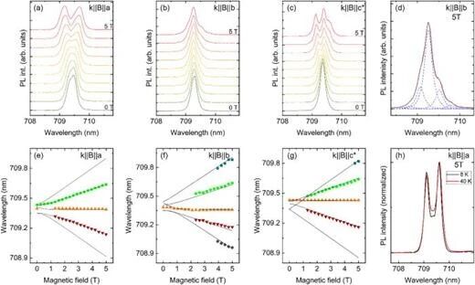 图2. 三种测量几何结构下高分辨率光致发光光谱随施加磁场变化的测量结果:k || B || a(a),k || B || b(b),以及 || B || c*(c)。(d) 在B=5 T条件下,k || B || b 测量获得的实验 PL 光谱(黑线),及其分解为五个 PL 分量(蓝虚线)与总和(红线)。(e)-(g) 取自 (a)-(c) 图的塞曼分量最大位置(符号)。实线表示采用自旋哈密顿量及文中列出的参数计算的塞曼分量能量。β-Ga2O3 晶体取向采用常规标记法。(h) 8 K(黑线)与 40 K(红线)下测得的 PL 光谱。测量在 5 T 磁场下进行,k || B || a。