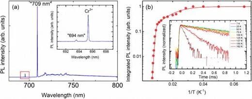 图1. (a) Mn 掺杂 β-Ga2O3 晶体在 7K 下测得的代表性光致发光光谱。插图为 690–700 nm 波段内 PL 发射的局部放大图。(b) 710 nm 谱线积分强度的阿伦尼乌斯图。插图展示了图中标注测量温度下 710 nm 发射的光衰减曲线。