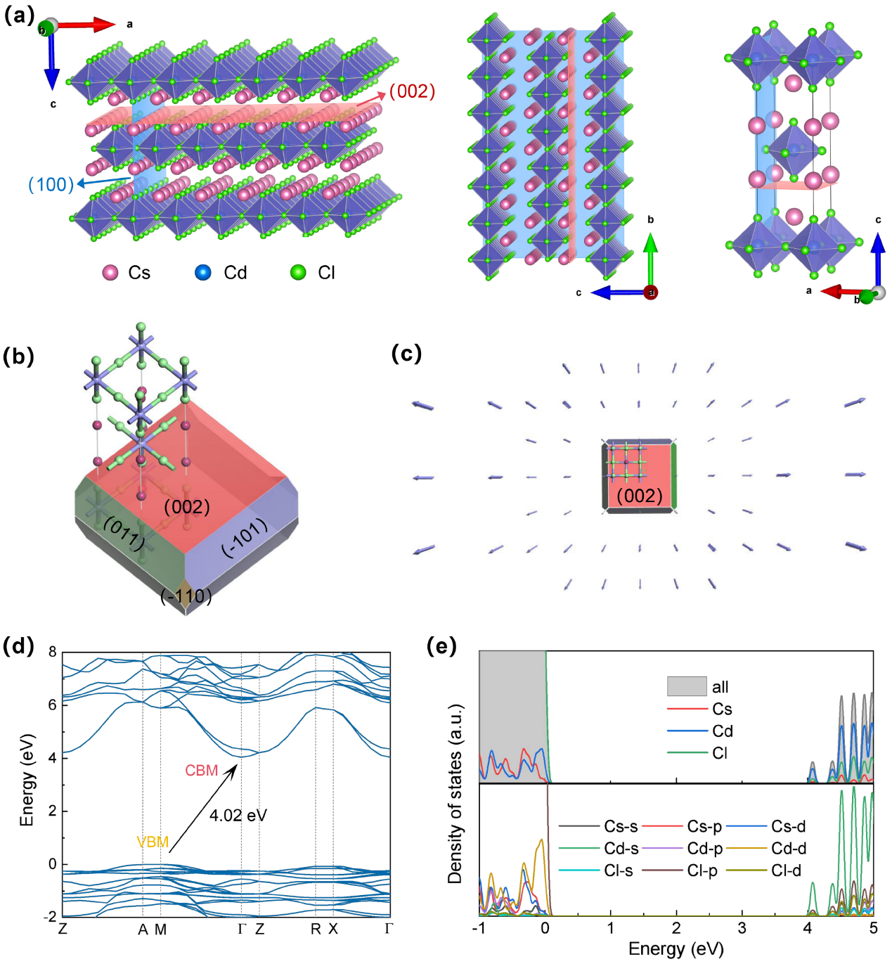 图 1. Cs2CdCl4 的晶体结构与电子特性. (a) 二维层状晶体结构示意图; (b) BFDH 模型预测的理论晶体形貌; (c) 单晶生长趋势示意图; (d) 能带结构; (e) 总态密度和投影态密度。