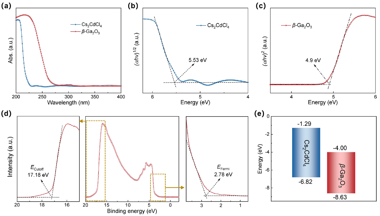 图 3. Cs2CdCl4 和 β-Ga2O3 的光学性质与能带分析. (a) Cs2CdCl4 薄膜和 β-Ga2O3 的吸收光谱; (b) Cs2CdCl4 薄膜的 Tauc 图; (c) β-Ga2O3 的 Tauc 图; (d) Cs2CdCl4 薄膜的 UPS 数据; (e) Cs2CdCl4/β-Ga2O3 异质结的能带排列示意图。