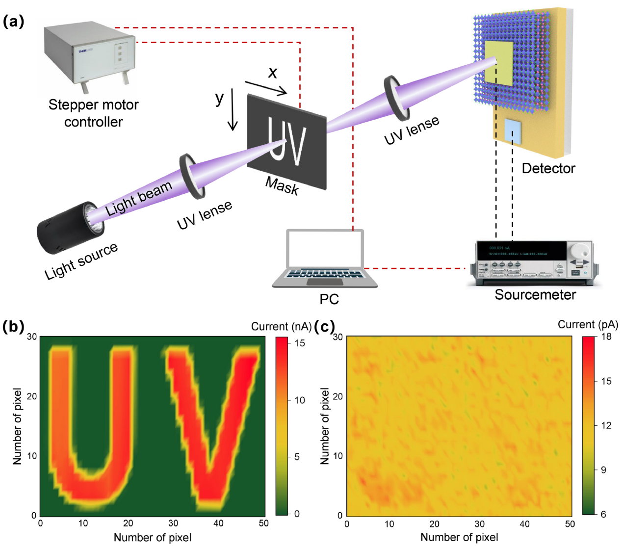 图 5. 基于 Cs2CdCl4/β-Ga2O3 异质结器件的日盲紫外成像系统. (a) 图像传感装置示意图; 器件在 (b) 265 nm 和 (c) 360 nm 光照条件 下, “UV”图案的成像结果。