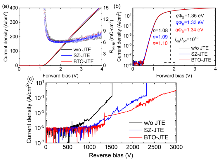 图3. β-Ga2O3 SBD 的正向 I-V 特性曲线:(a)线性坐标,(b)半对数坐标,(c)制备的 β-Ga2O3 SBD 的反向击穿 I-V 特性曲线。