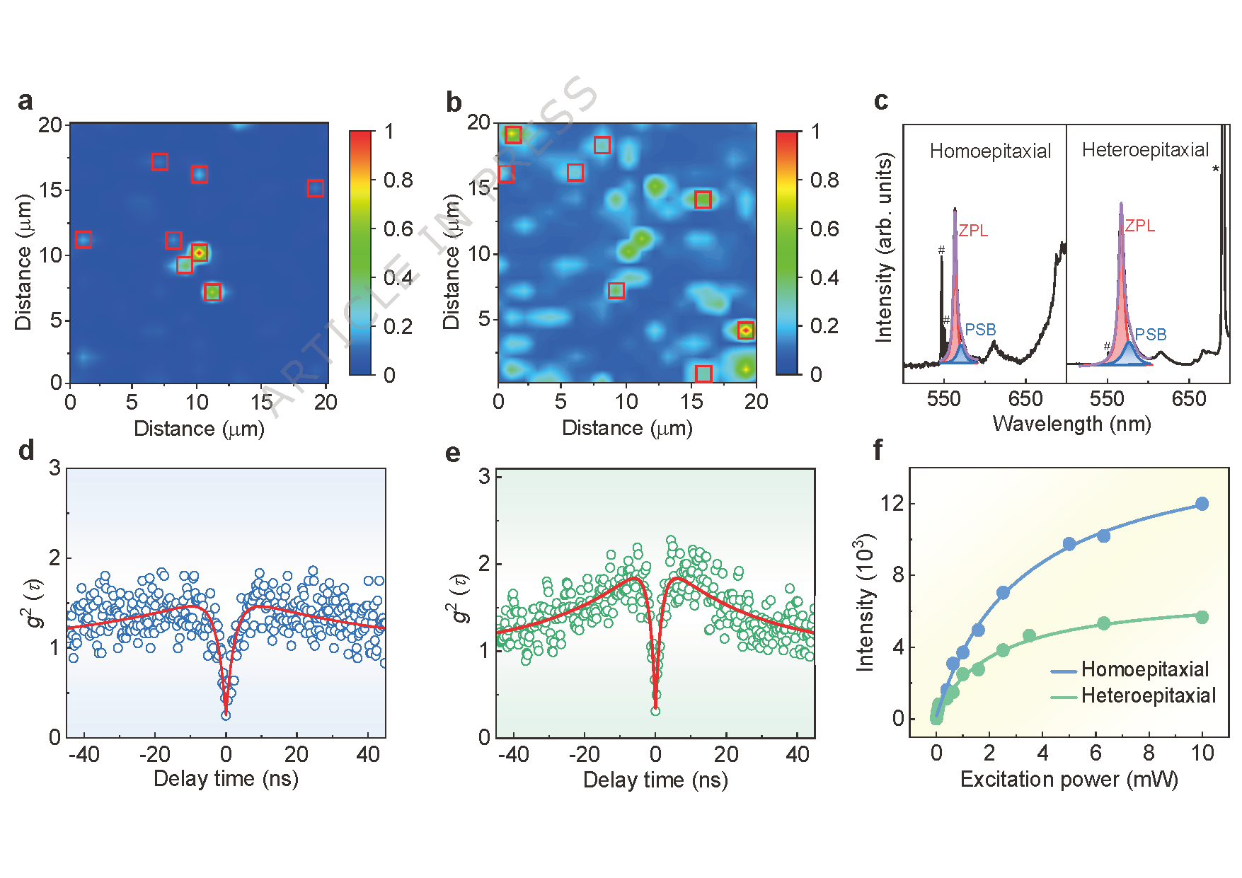 图2. β-Ga2O3 室温单光子探针特性表征。(a,b) 同质外延 β-Ga2O3 薄膜 (a) 与异质外延 β-Ga2O3 薄膜 (b) 的归一化共聚焦光致发光 (PL) 强度图。红色方框标记孤立发光点。(c) 通过洛伦兹函数拟合的 PL 光谱,用于获取同质外延与异质外延 β-Ga2O3 薄膜中零声子线 (ZPL) 与声子边带 (PSB) 的各自权重。方格与星号标记的峰分别源自 β-Ga2O3 的拉曼模式及蓝宝石衬底。(d,e) 在 5 mW 连续波激光激发下测得的同质外延 β-Ga2O3 薄膜 (d) 与异质外延 β-Ga2O3 薄膜 (e) 中单光子发射器 (SPEs) 的二阶相关函数 g2(τ)。(f) 同质外延/异质外延 β-Ga2O3 薄膜中 SPEs 发射强度的饱和行为及其理论拟合曲线。