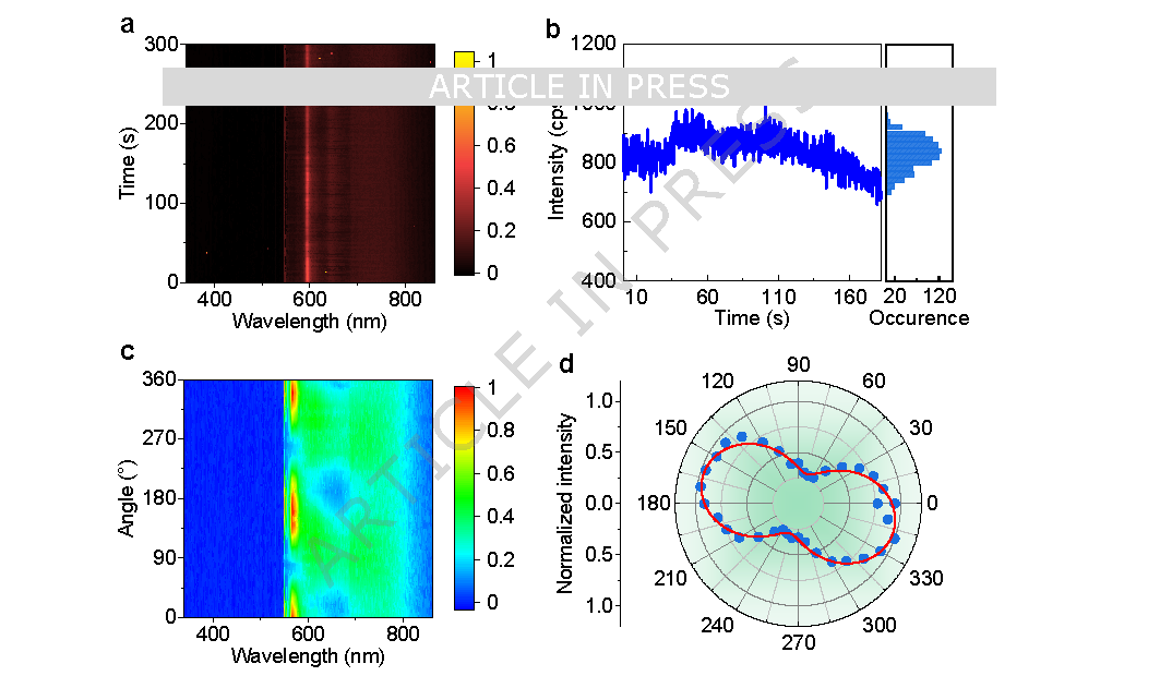图3. 同质外延 β-Ga2O3 薄膜中单点发光器件的光稳定性与极化特性。(a) 在 5 mW 激发功率和 1 s 积分时间下测得的量子发光器件光致发光光谱稳定性测试。(b) 采样时间间隔为 200 ms 的发光器件随时间变化的光致发光强度,未观察到明显闪烁或褪色现象。(c) 量子发射器的归一化极化依赖性 PL 光谱等值线图。(d) PL 强度与极化角 θ 的极坐标图。数据经 cos2(θ) 拟合函数处理,获得 54 % 的极化可见度。