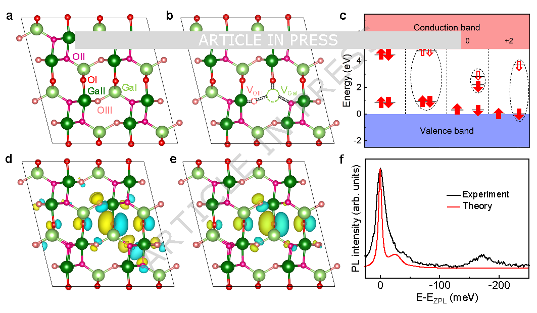 图5. 基于 SPEs 缺陷的首阶原理计算。(a)取向为 [010] 的 β-Ga2O3 超胞。黑色轮廓线勾勒其轮廓,共包含 160 个原子。晶体学上不同的 Ga 和 O 位点以不同颜色标注:GaΙ 为浅绿色,GaΙΙ 为深绿色,OΙ 为红色,OΙΙ 为洋红色,OΙΙΙ 为粉红色。(b) VGaI-VOIII 缺陷的示意结构图。(c) VGaI-VOIII 缺陷的 Kohn–Sham 能级图。带隙中的占据态与未占据态分别以实心箭头和空心箭头表示。箭头方向表示电子自旋,可能的光学跃迁处标有黑色虚心圆圈。(d,e) 中性 VGaI-VOIII 缺陷中与光学跃迁相关的最高占据态 (d) 和最低未占据态 (e) 的波函数。(f) 中性 VGaI-VOIII 缺陷的计算光致发光光谱(红色)与实验数据(黑色)对比。为便于比较声子边带的形状与分布,两光谱能量均相对于零点电位水平方向偏移。