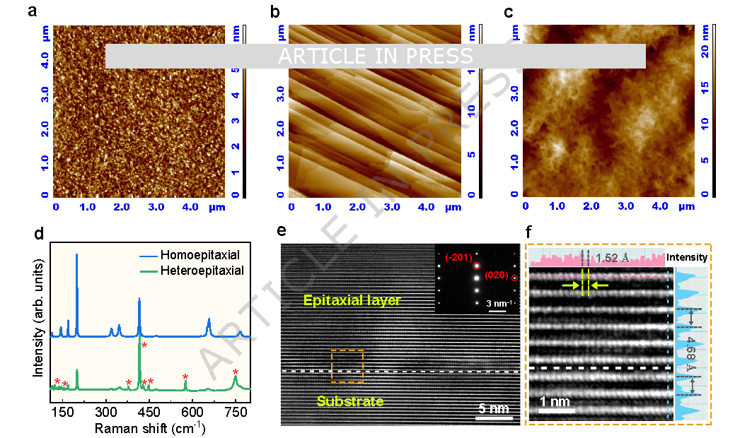 图1. 外延 β-Ga2O3 薄膜的表征结果。(a-c) 分别展示单晶 β-Ga2O3 晶圆 (a)、生长于蓝宝石衬底上的同质外延 β-Ga2O3 薄膜 (b) 及异质外延 β-Ga2O3 薄膜 (c) 的原子力显微镜 (AFM) 图像。(d) 同质外延与异质外延 β-Ga2O3 薄膜的拉曼光谱。星号标注蓝宝石衬底的拉曼峰。(e) 沿β-Ga2O3 [102] 晶面方向拍摄的同质外延 β-Ga2O3 界面高分辨透射电子显微镜 (HRTEM) 图像。(f) (e) 图中橙框区域的放大视图及沿垂直虚线方向的对应原子强度分布曲线。