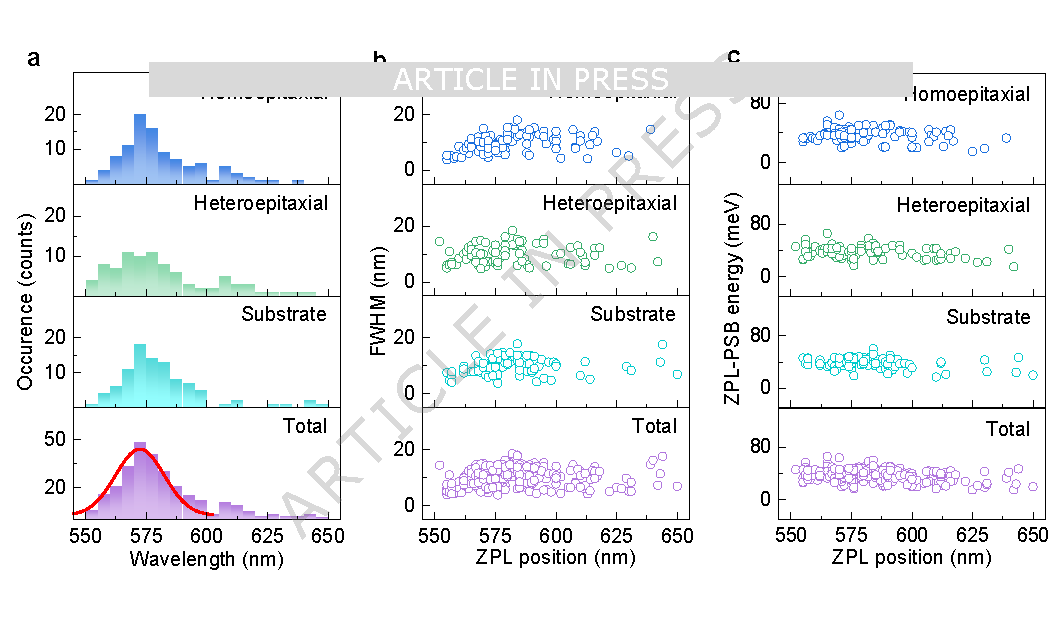 图4. 不同 β-Ga2O3 样品中量子发射体的统计分析。(a) ZPL 波长分布直方图,每 5 nm 为一个区间。红色曲线为 ZPL 波长的高斯拟合。(b,c) ZPL 半高全宽 (FWHM) 分布 (b) 与 ZPL-PSB 能量间隔分布 (c)。