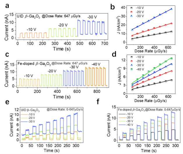 图3. (a) UID β-Ga2O3 探测器在不同偏压下接受 X 射线照射时的时域响应(剂量率:647 μGy/s);(b) UID β-Ga2O3 器件的 X 射线剂量率与电流关系曲线。(c) 掺铁 β-Ga2O3 探测器在不同偏压下接受 X 射线照射时的时域响应(剂量率:647 μGy/s)。(d) Fe 掺杂 β-Ga2O3 器件中 X 射线剂量率与电流的关系。(e) UID β-Ga2O3 探测器与 (f) Fe 掺杂 β-Ga2O3 探测器在 X 射线照射下随剂量率线性增加的时域响应。