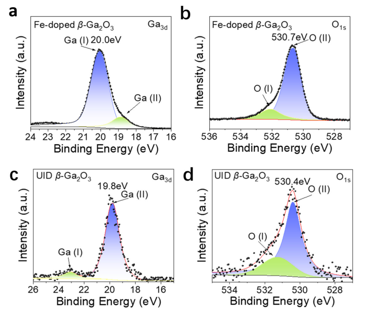 图1. Fe 掺杂 β-Ga2O3 的 XPS 光谱:(a) Ga3d 区,(b) O1s 区。未掺杂 β-Ga2O3 的 XPS 光谱:(c) Ga3d 区,(d) O1s 区。
