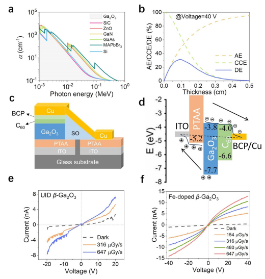 图2. (a) 不同半导体的衰减系数比较,(b) β-Ga2O3 的计算衰减系数 (AE)、 (c) β-Ga2O3 基 X 射线探测器的横截面示意图,(d) 平衡条件下能量分布示意图,以及 (e) UID β-Ga2O3 基探测器与 (f) 铁掺杂 β-Ga2O3 探测器的 I-V 特性曲线。