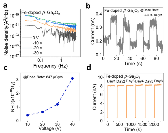 图4. (a) 铁掺杂 β-Ga2O3 探测器的噪声谱,(b) 检测限,(c) 噪声等效剂量(NED),(d) 器件稳定性。