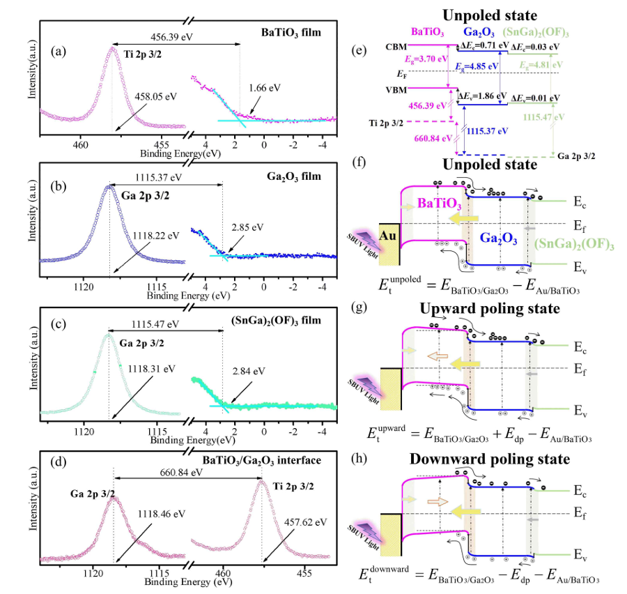 图 6. (a) BaTiO₃、Ga₂O₃ 和 (SnGa)₂(OF)₃ 薄膜的 Ti 2p、(b) Ga 2p 和 (c) Ga 2p 核能级及价带谱。(d) BaTiO₃/Ga₂O₃ 异质结界面处的 Ga 2p 和 Ti 2p 核能级。(e) BaTiO₃ 层处于未极化状态时,BaTiO₃/Ga₂O₃/(SnGa)₂(OF)₃ 多层薄膜的能带排列示意图。(f–h) BaTiO₃/Ga₂O₃ 异质结器件在 (f) 未极化、(g) 上向极化和 (h) 下向极化状态下的能带结构示意图。