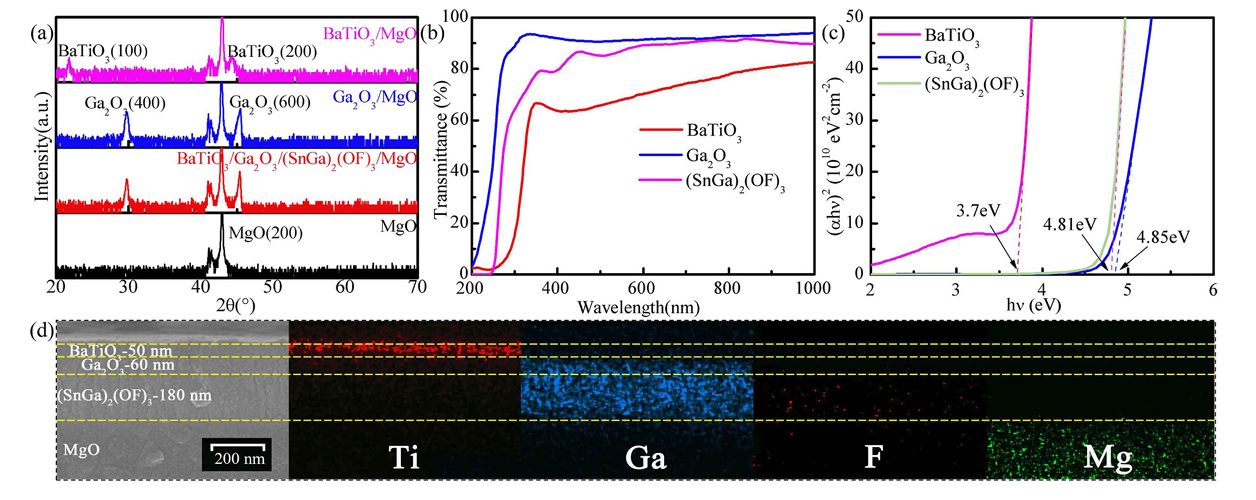 图 1. (a) 在 MgO (100) 衬底上生长的 BaTiO₃、Ga₂O₃ 和 BaTiO₃/Ga₂O₃/(SnGa)₂(OF)₃ 薄膜的 X 射线衍射(XRD)图谱;(b) 光学透射谱;(c) BaTiO₃、Ga₂O₃ 和 (SnGa)₂(OF)₃ 薄膜的 (αhν)² 对 hν 的关系图;(d) BaTiO₃/Ga₂O₃/(SnGa)₂(OF)₃/MgO 多层薄膜的截面场发射扫描电子显微镜(FE-SEM)图像及对应的能谱(EDS)元素分布图。